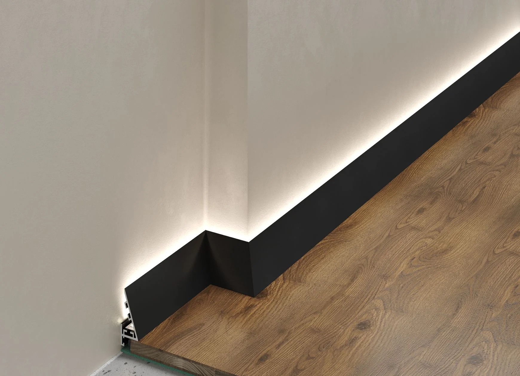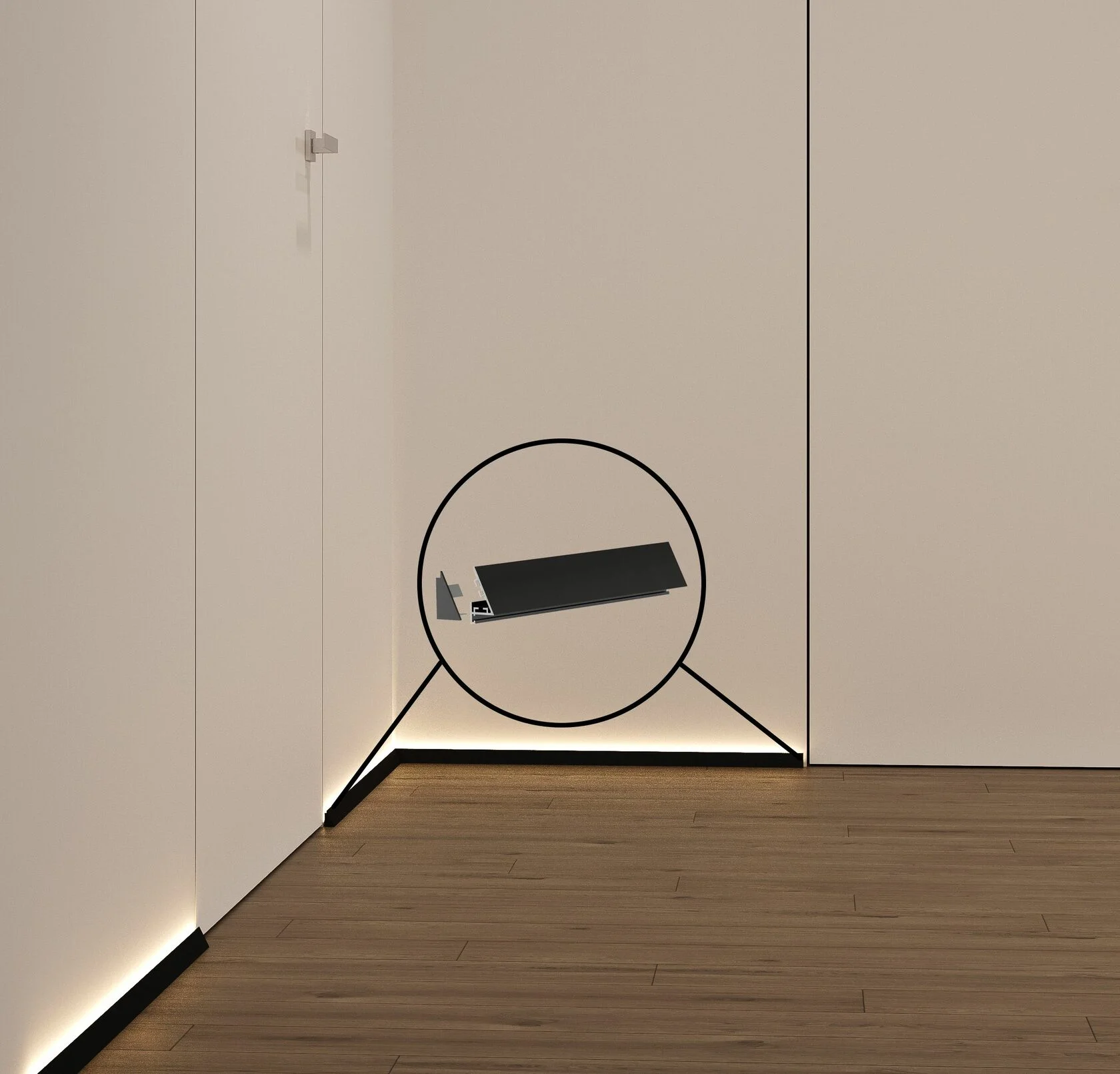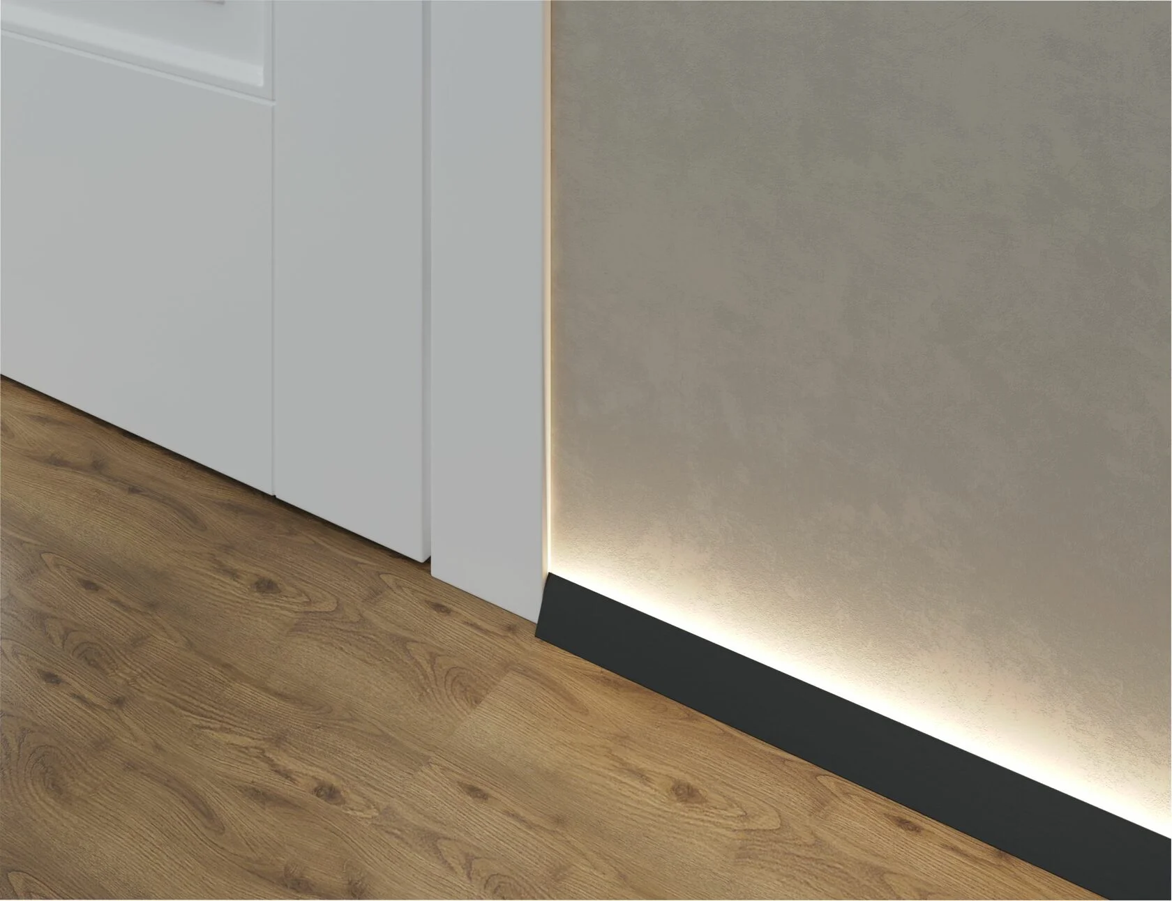 Этот микроплинтус создан для того, чтобы привнести в помещение лёгкость и визуальную воздушность. Благодаря интеграции подсветки появляется эффект «парящих стен», а текстурные поверхности становятся ещё более объёмными. Такой профиль моментально формирует нужную атмосферу и способен преобразить любое помещение, подчеркнув его индивидуальность.