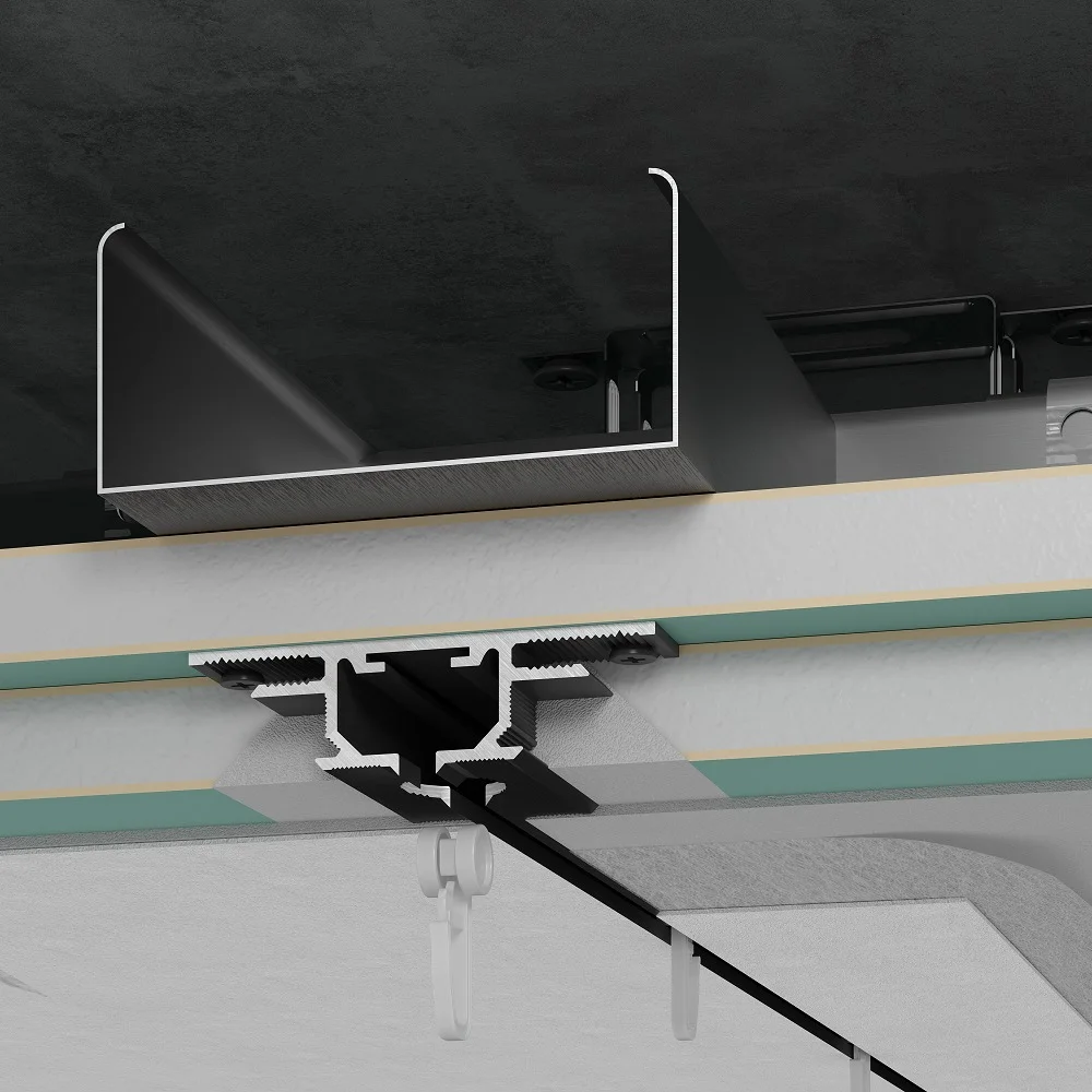 Обеспечивает скрытую установку штор. Отсутствие громоздкой классической гардины избавляет пространство от лишнего визуального шума и придаёт помещению лёгкость, создавая эффект, будто штора парит под потолком.