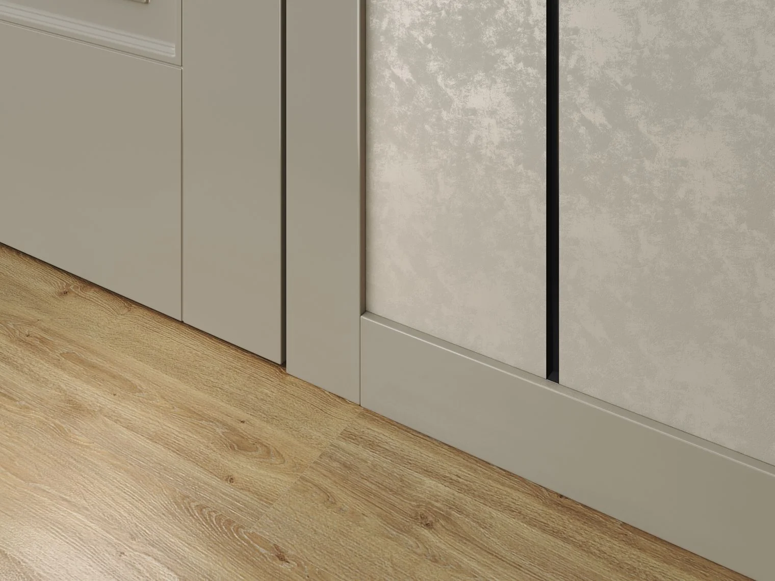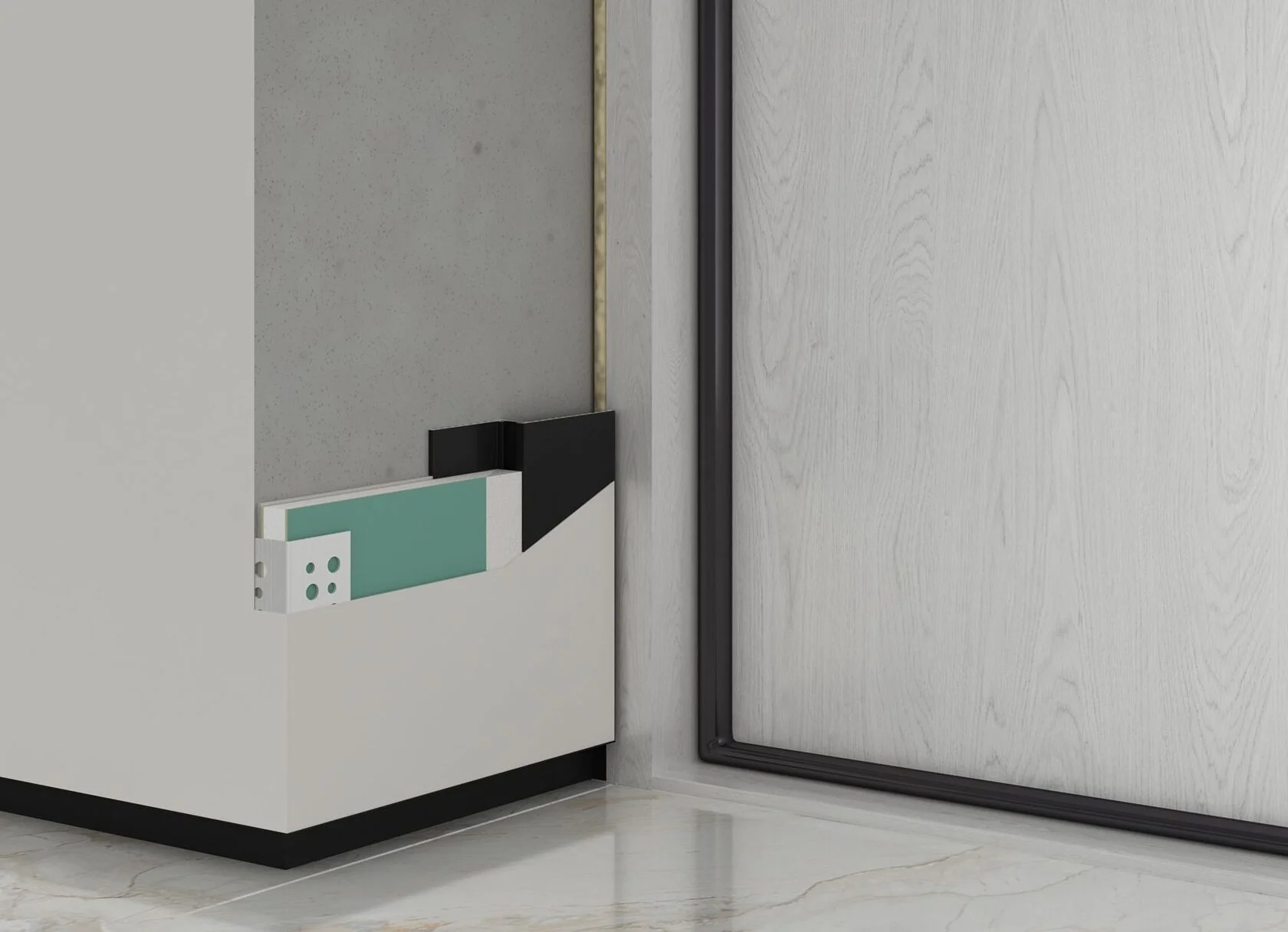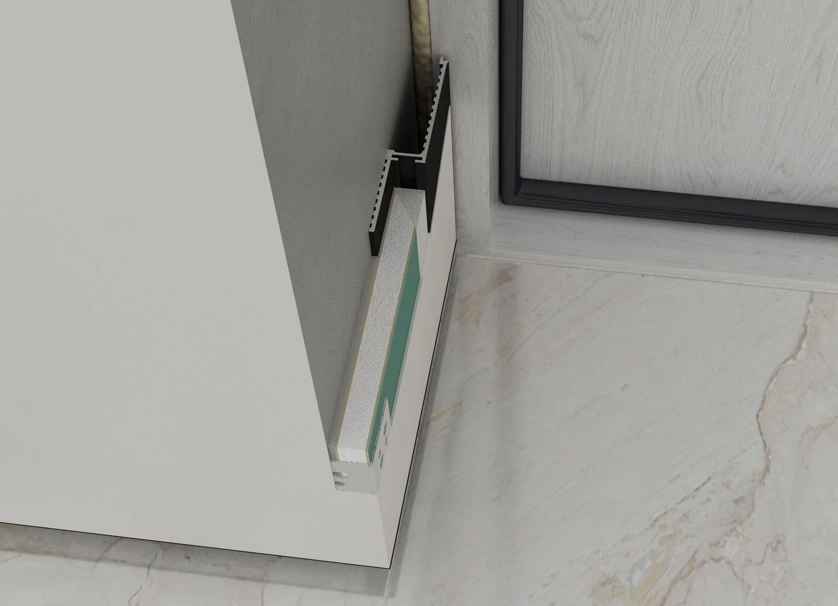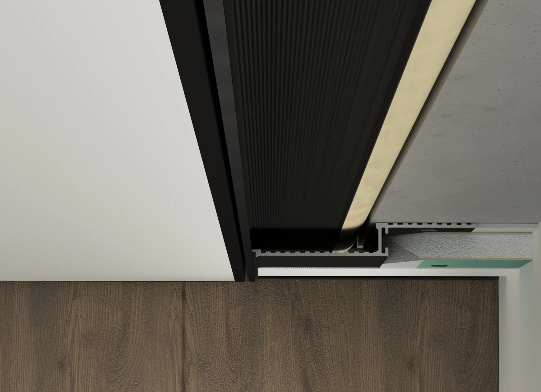За счёт объёмной теневой линии переход выглядит максимально деликатным и практически незаметным, создавая чистый современный интерьер без визуального шума.