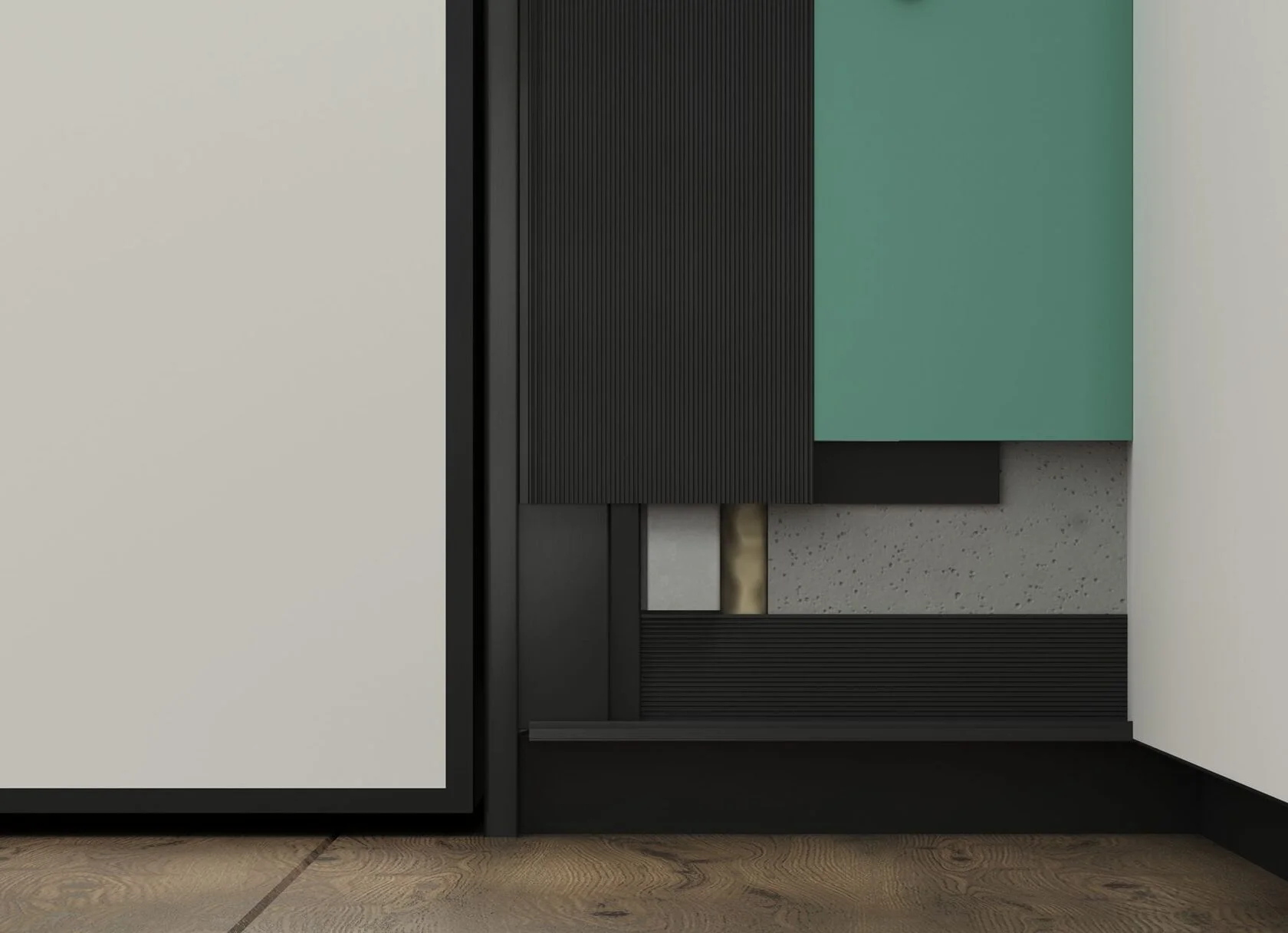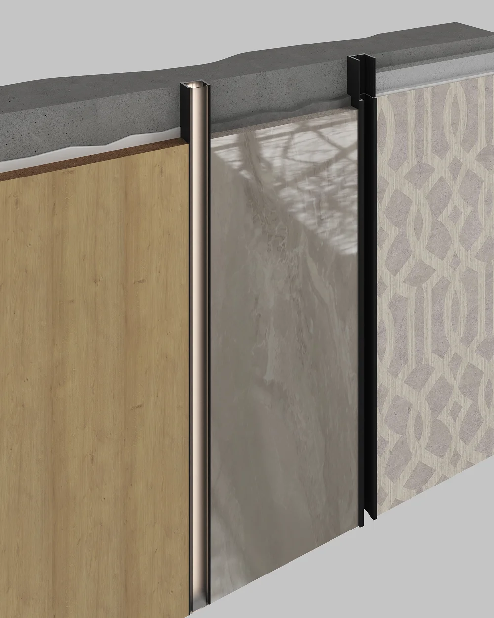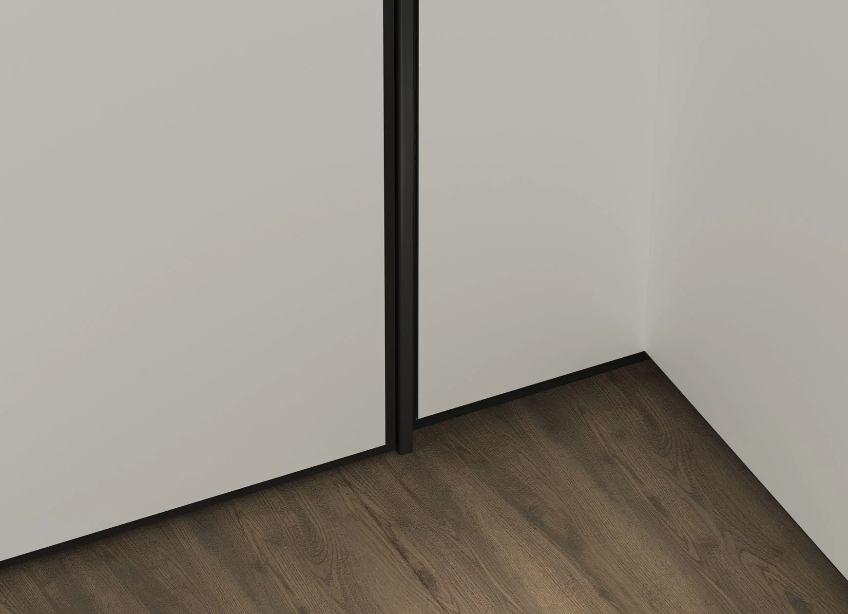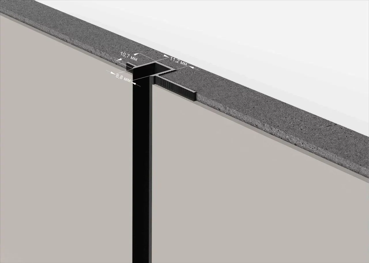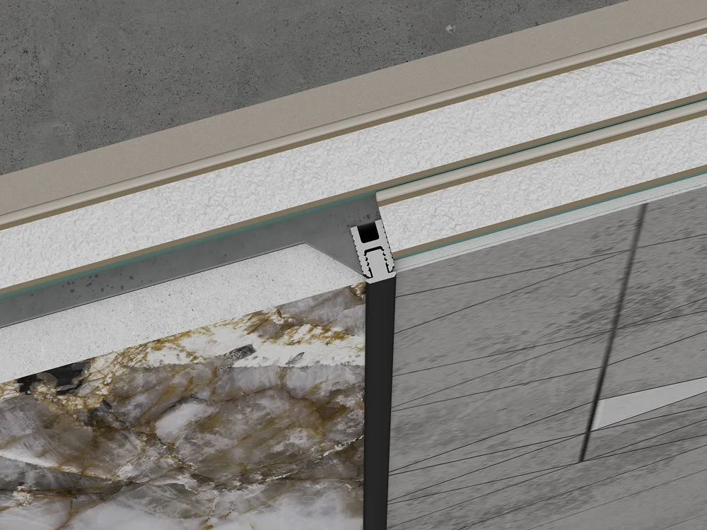 За счёт объёмной теневой линии переход выглядит максимально деликатным и практически незаметным, создавая чистый современный интерьер без визуального шума.