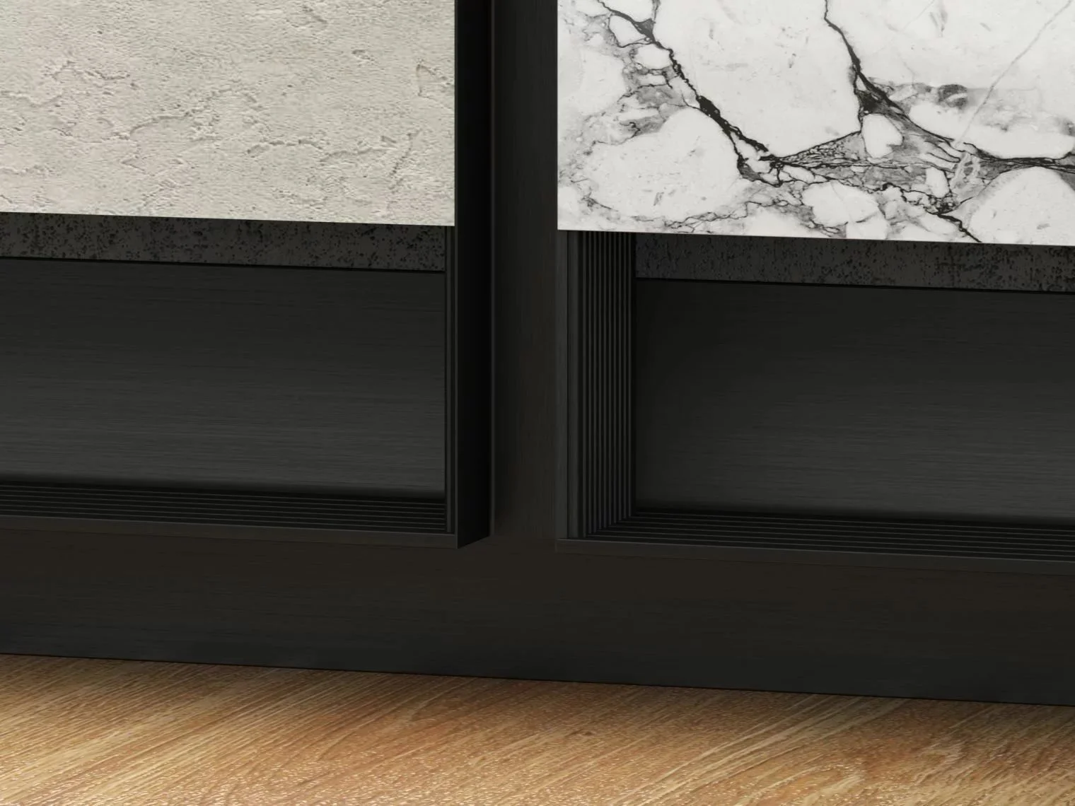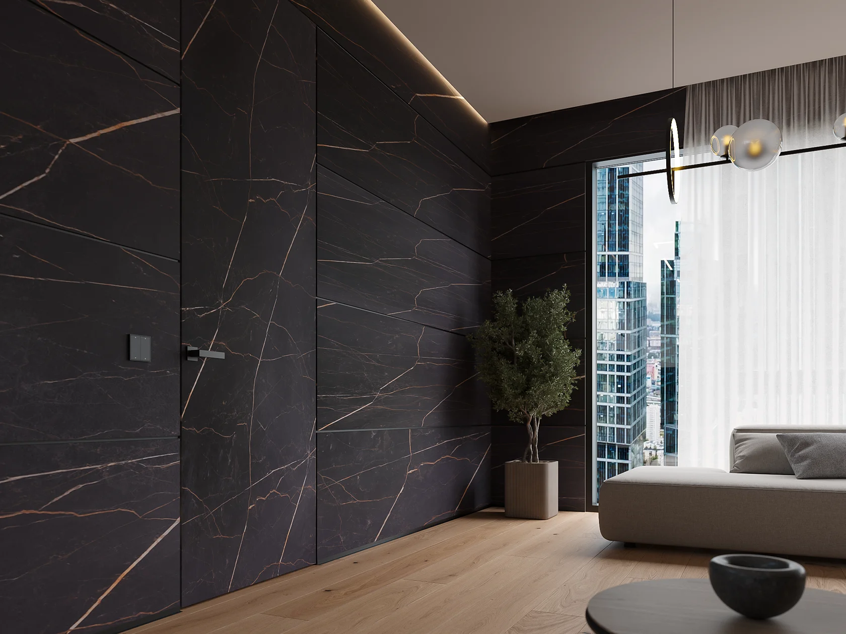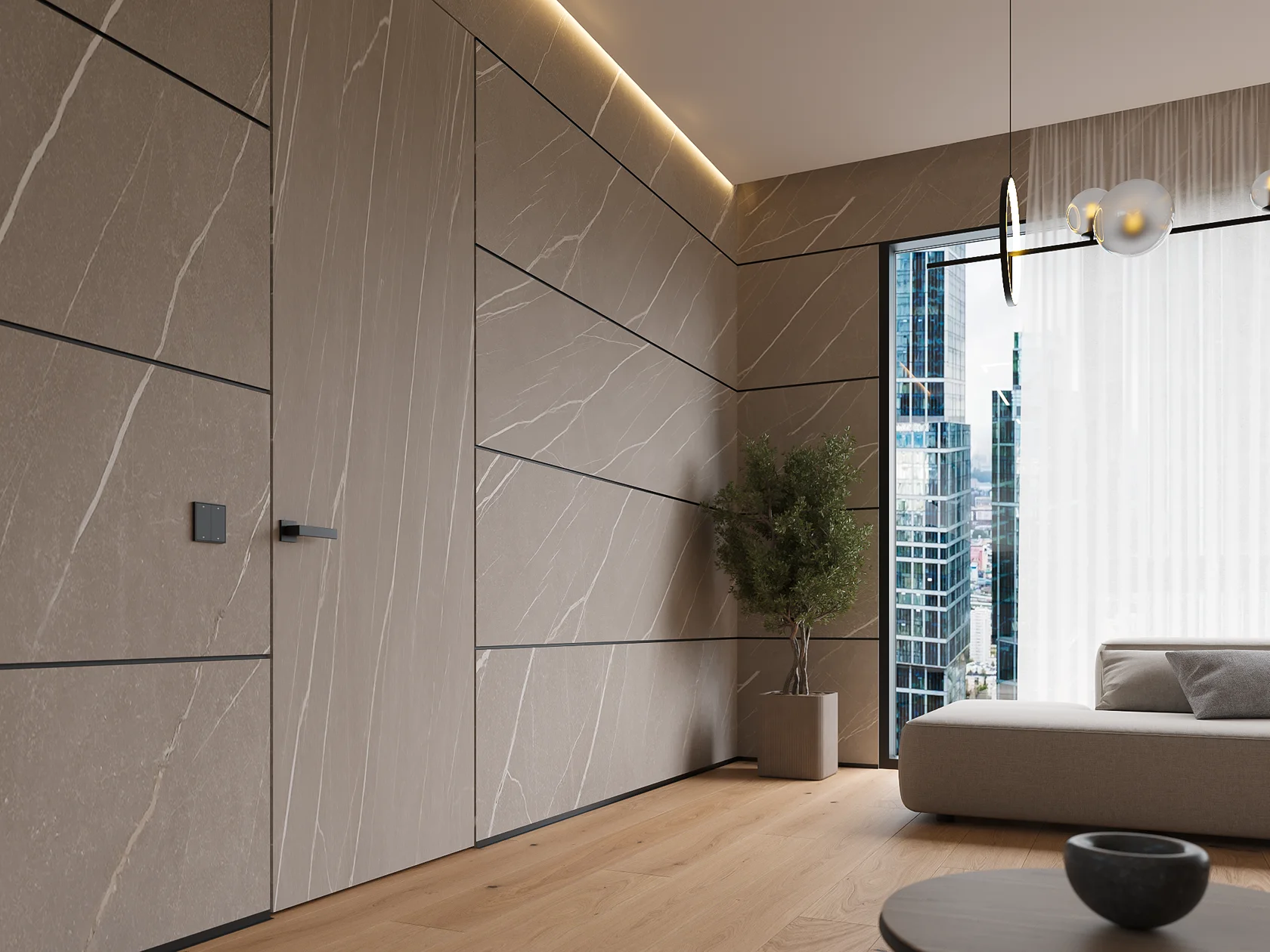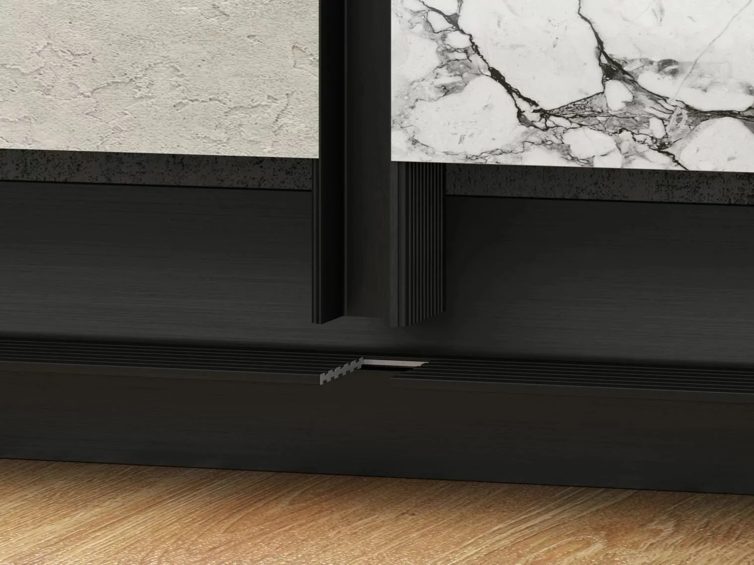 За счёт объёмной теневой линии переход выглядит максимально деликатным и практически незаметным, создавая чистый современный интерьер без визуального шума.