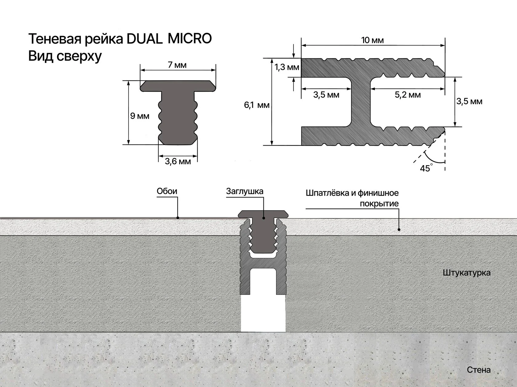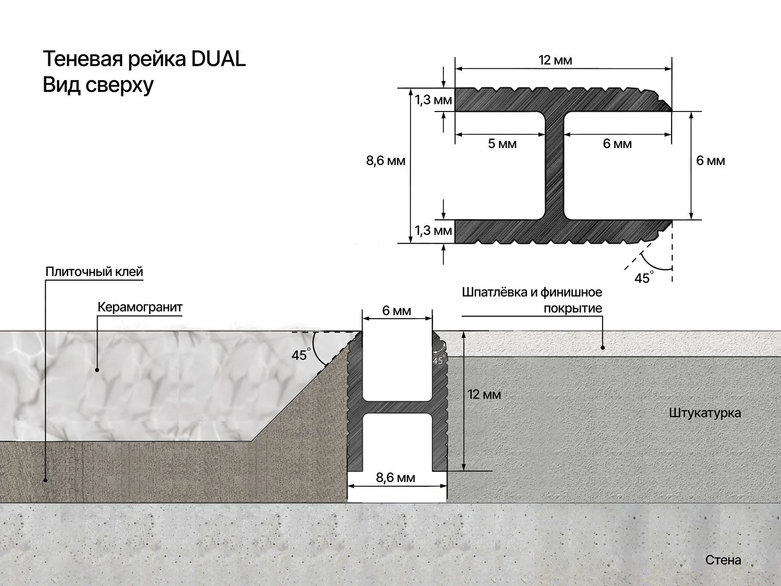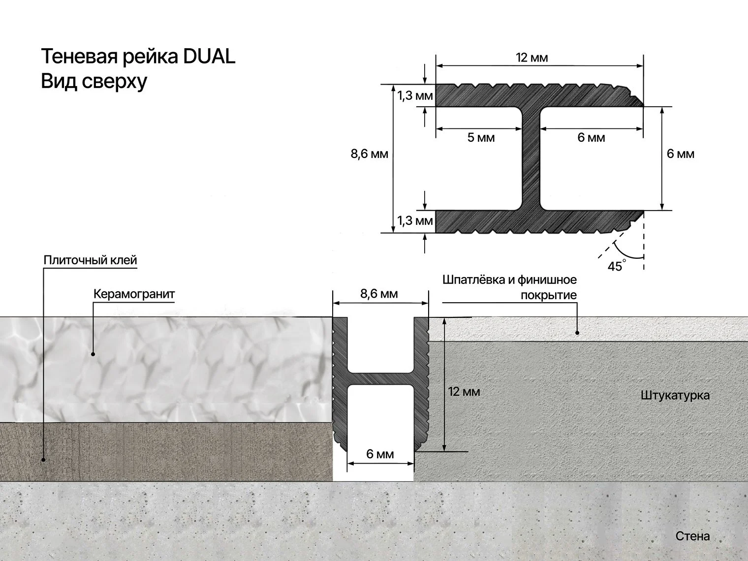 Теневая рейка DUAL mini — универсальный декоративно-разделительный профиль с широким спектром применения. Эта модель позволяет выполнять аккуратные переходы между различными материалами: например, перейти от керамогранита или его имитации к краске или декоративной штукатурке в одной плоскости, сохранив общую геометрию стены.