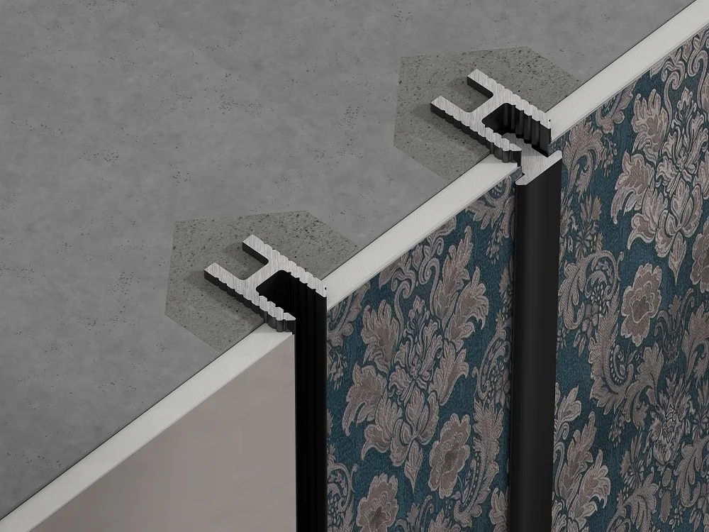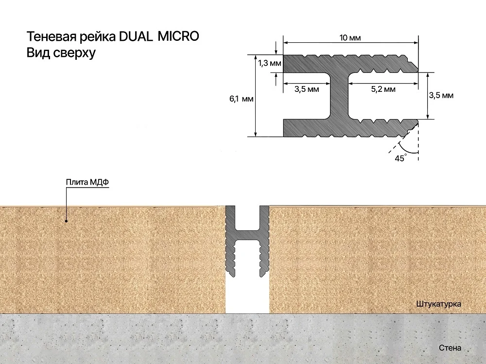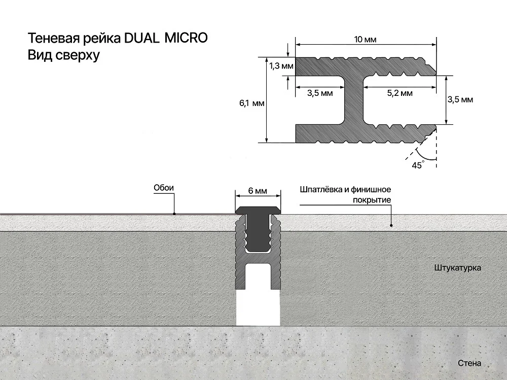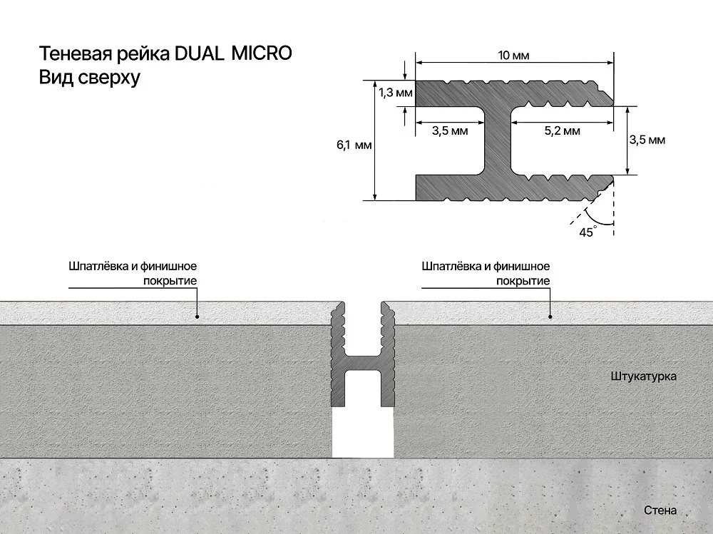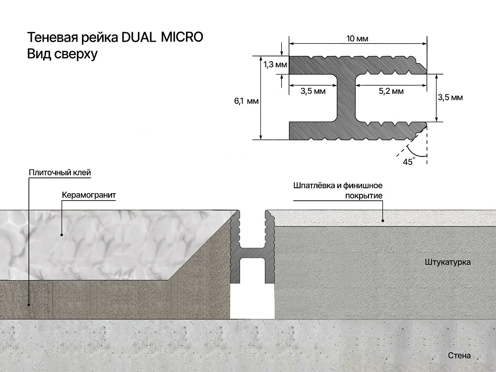 Теневая рейка DUAL mini — универсальный декоративно-разделительный профиль с широким спектром применения. Эта модель позволяет выполнять аккуратные переходы между различными материалами: например, перейти от керамогранита или его имитации к краске или декоративной штукатурке в одной плоскости, сохранив общую геометрию стены.