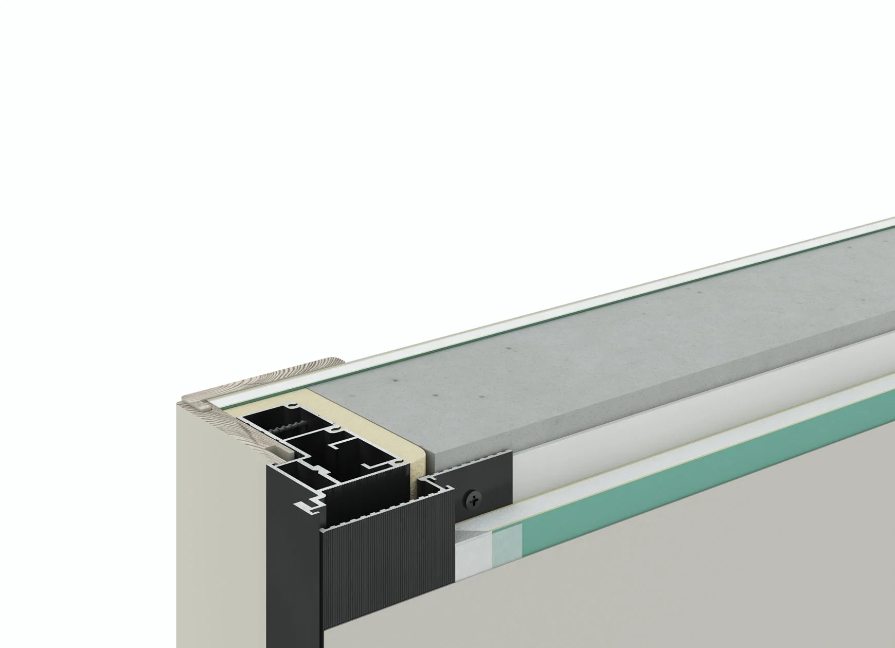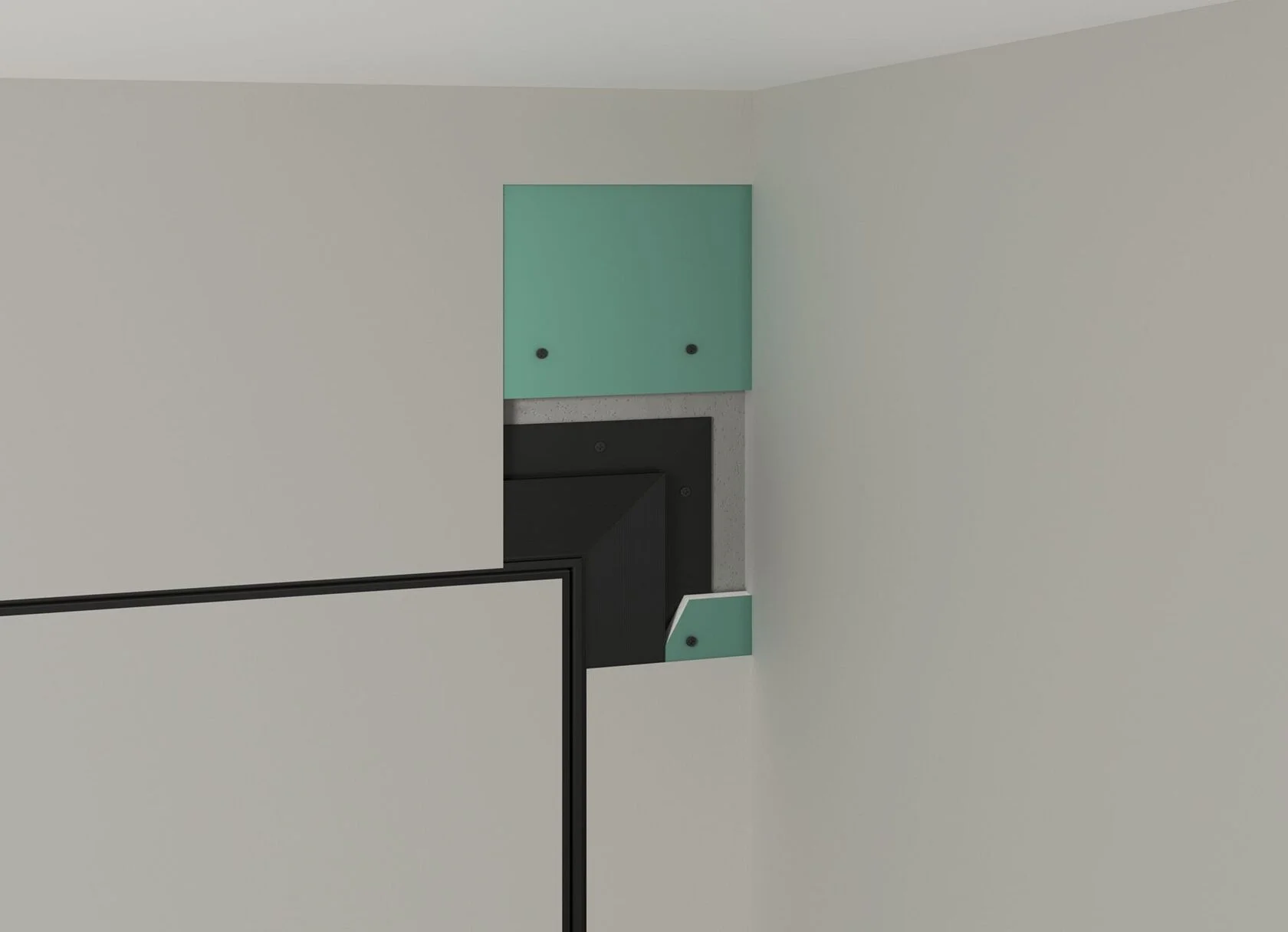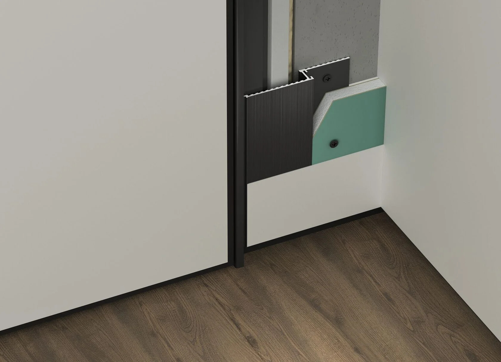 Этот профиль создаёт разрывное соединение между стеной и коробом двери скрытого монтажа (Invisible), благодаря чему конструкция короба становится независимой от поверхности стены. Такое решение предотвращает передачу вибрации на штукатурку и финишное покрытие — исключая риск появления трещин. Острый штукатурный маячок профиля обеспечивает ровное и аккуратное примыкание шпаклёвки.