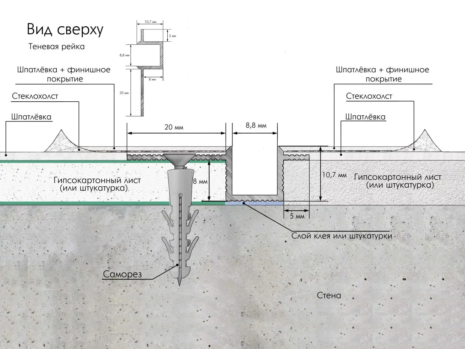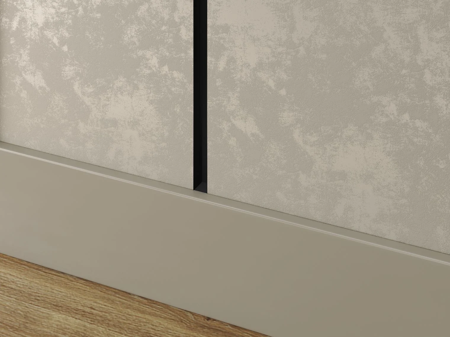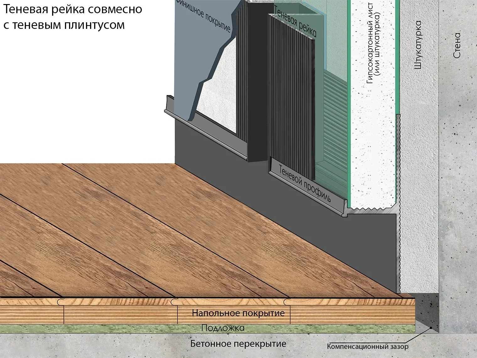 Профиль формирует аккуратный теневой шов глубиной 10 мм, который добавляет стенам выразительность и создаёт эффект «парящей поверхности». Теневая рейка идеально сочетается с теневым плинтусом, образуя единую концепцию современного минималистичного интерьера.