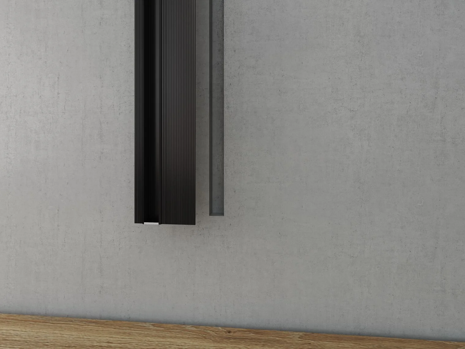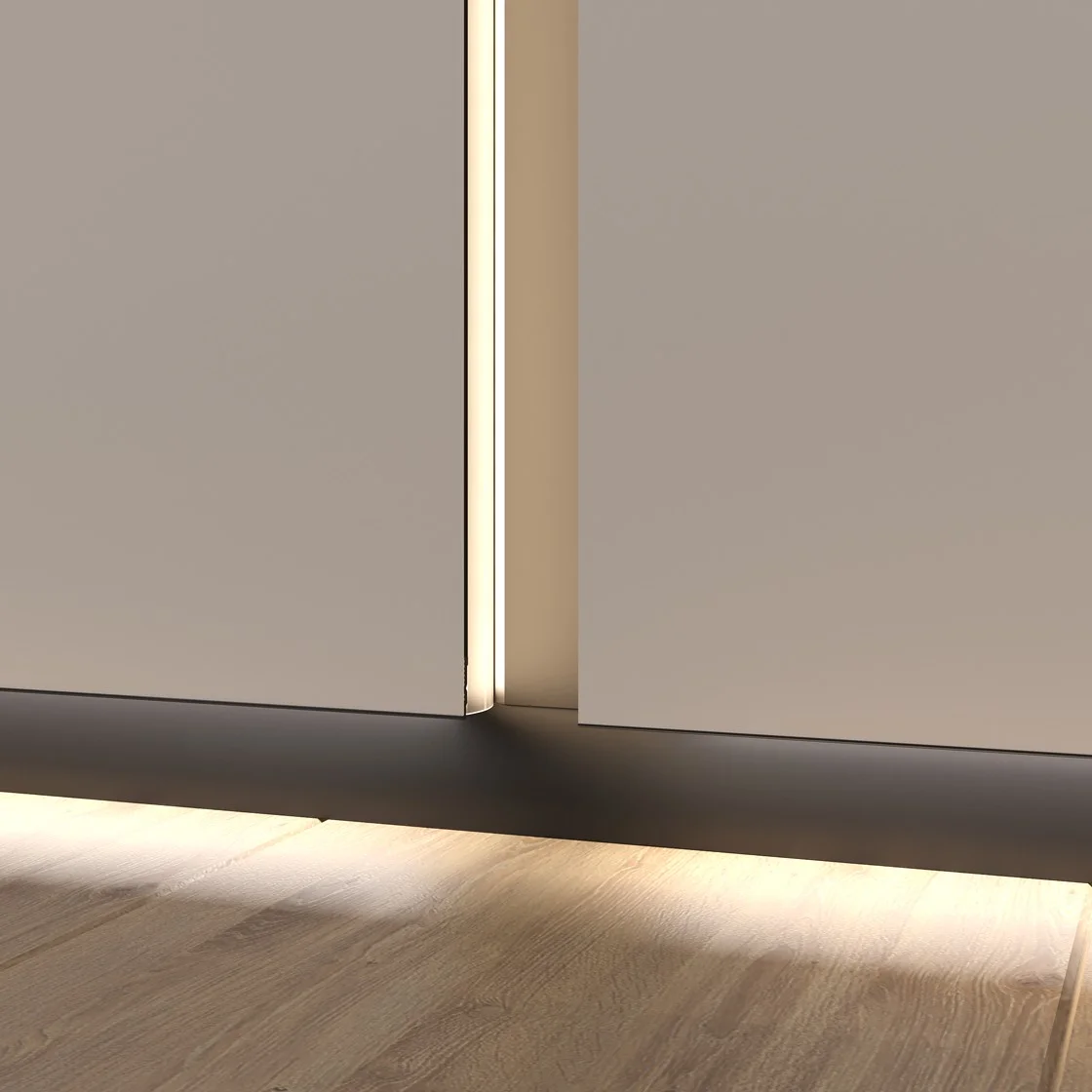 Теневая рейка LIGHT под подсветку имеет продуманную конструкцию, благодаря которой ни светодиодная лента, ни рассеиватель не видны за кромкой профиля. В выключенном состоянии вы видите обычный аккуратный вертикальный теневой шов. Но стоит включить подсветку — профиль превращается в эффектную световую линию, добавляя интерьеру глубину и архитектурную выразительность.