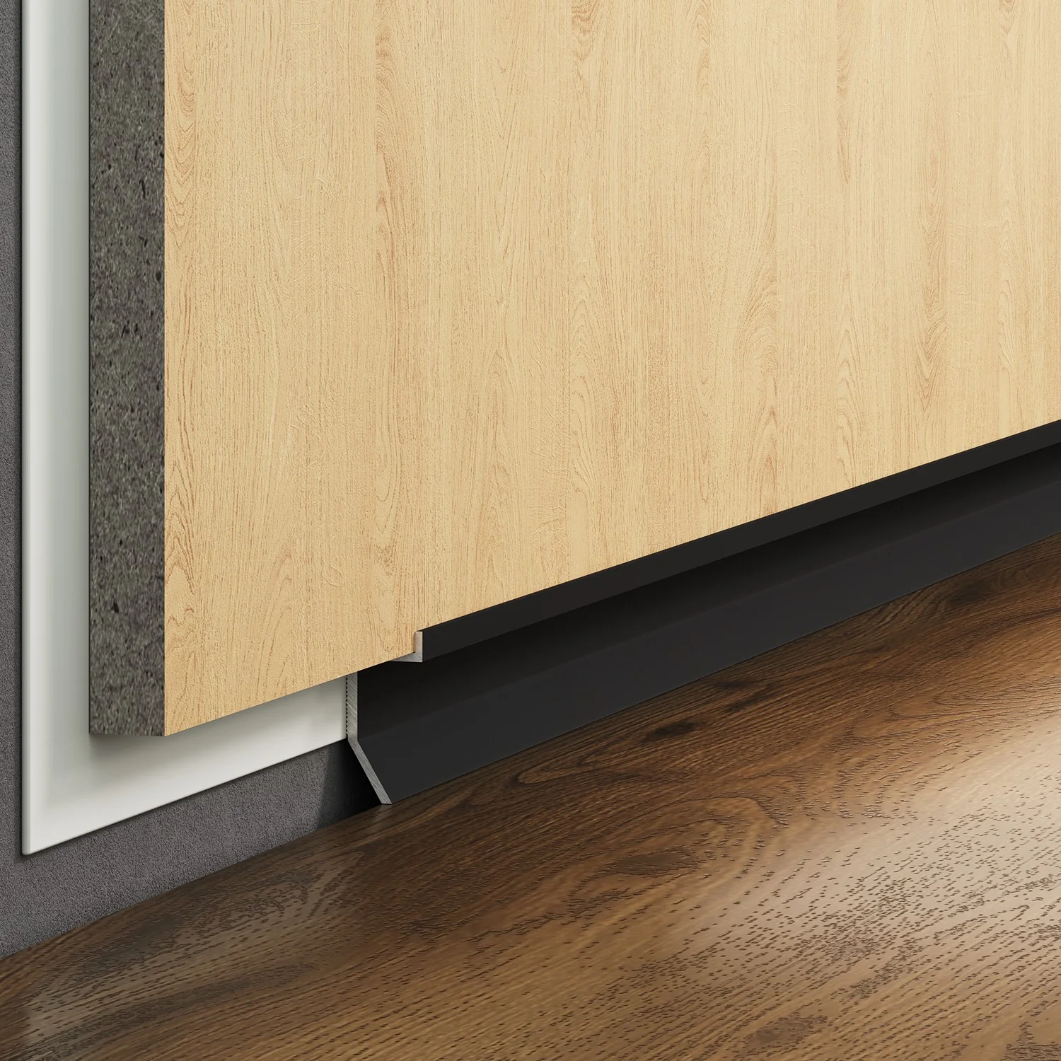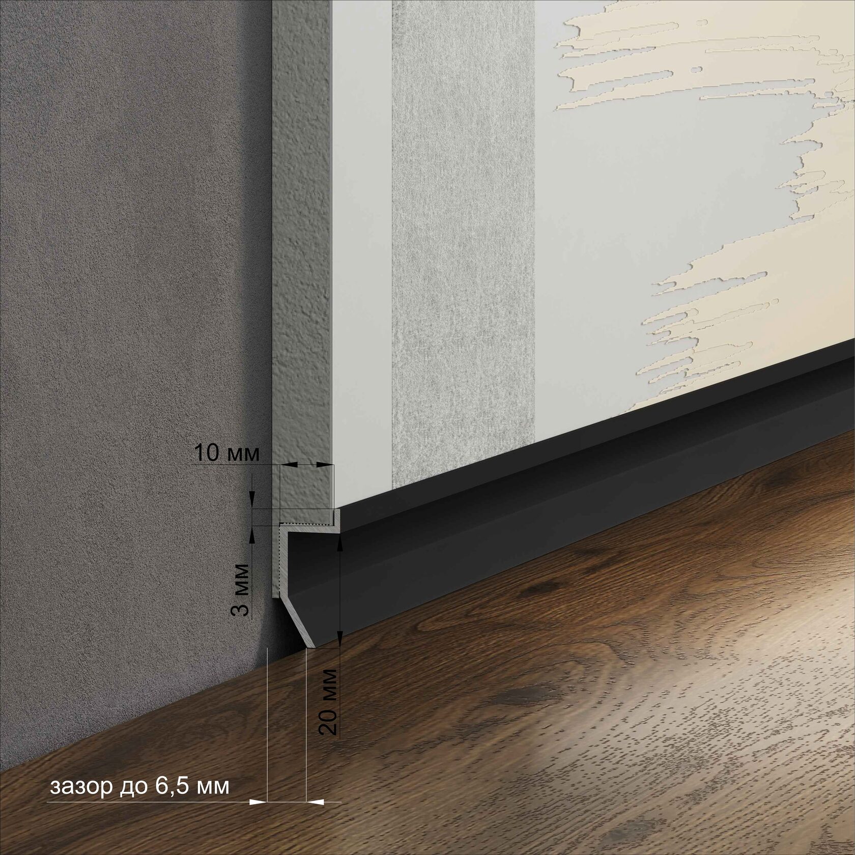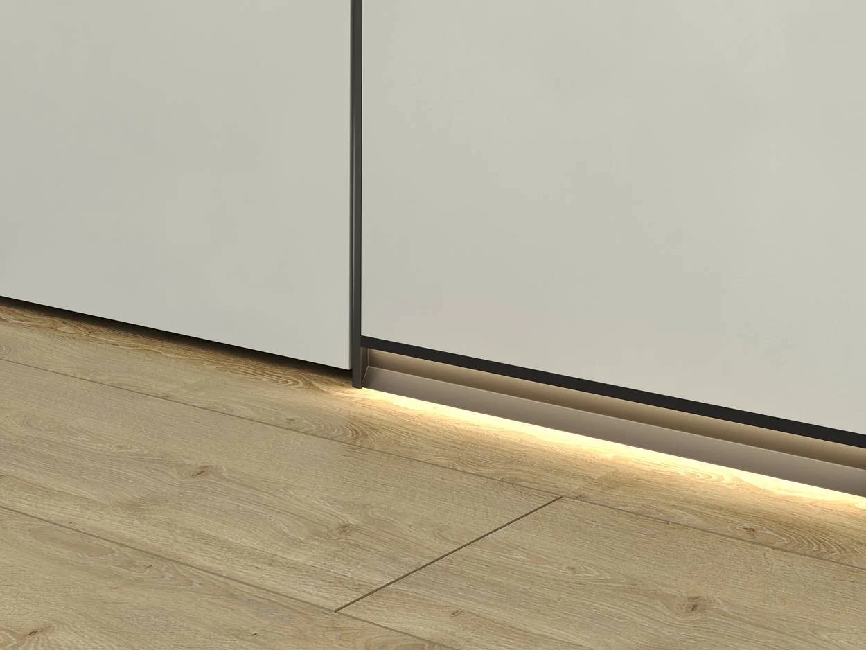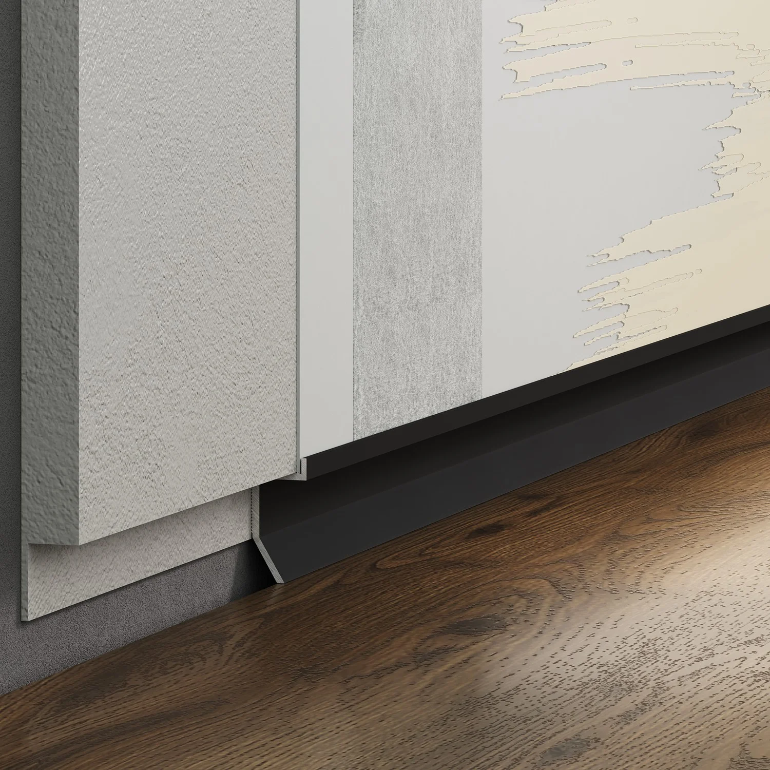 Главное преимущество — возможность установки после завершения всех отделочных работ и укладки напольного покрытия. Это делает профиль удобным и практичным решением при ремонте. Теневой плинтус NOVEL не только создаёт эффект «парящей» стены, но и выполняет важные функции. Бортик толщиной 4 мм маскирует неровности обрезанных панелей или штукатурки, а также защищает края отделочных материалов от повреждений.